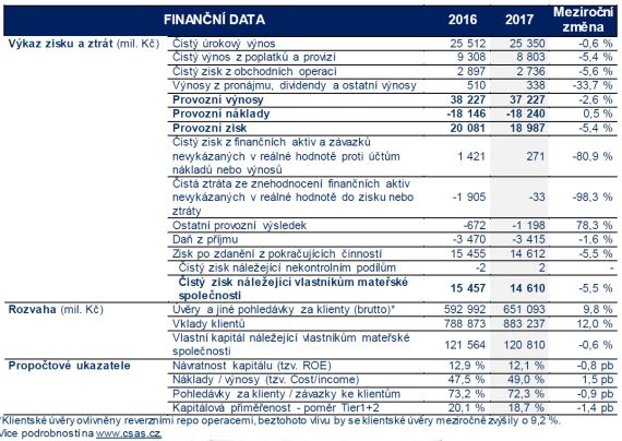 Za rok 2017 dosáhl konsolidovaný čistý zisk České spořitelny výše 14,6 mld. Kč
