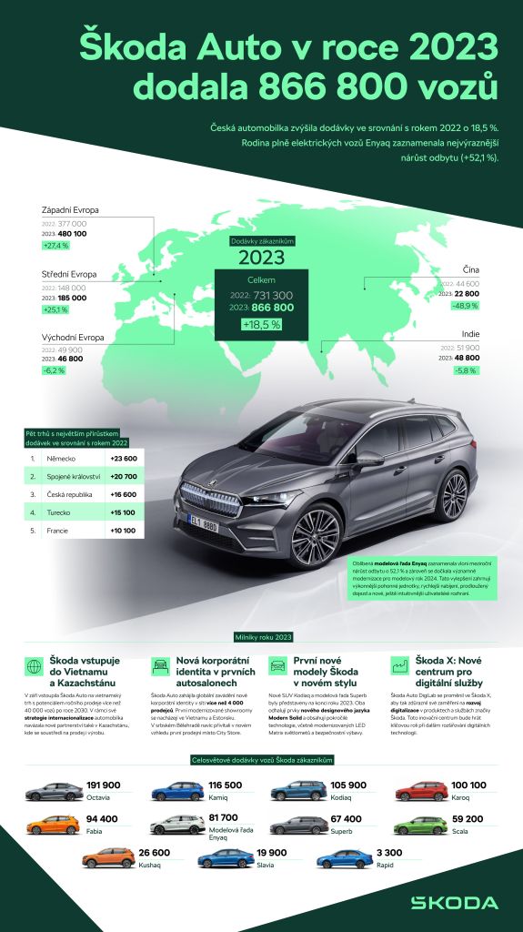 Škoda Auto dodala v roce 2023 celosvětově 866 800 vozů